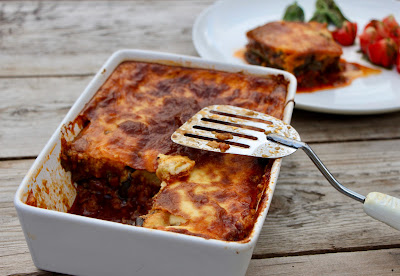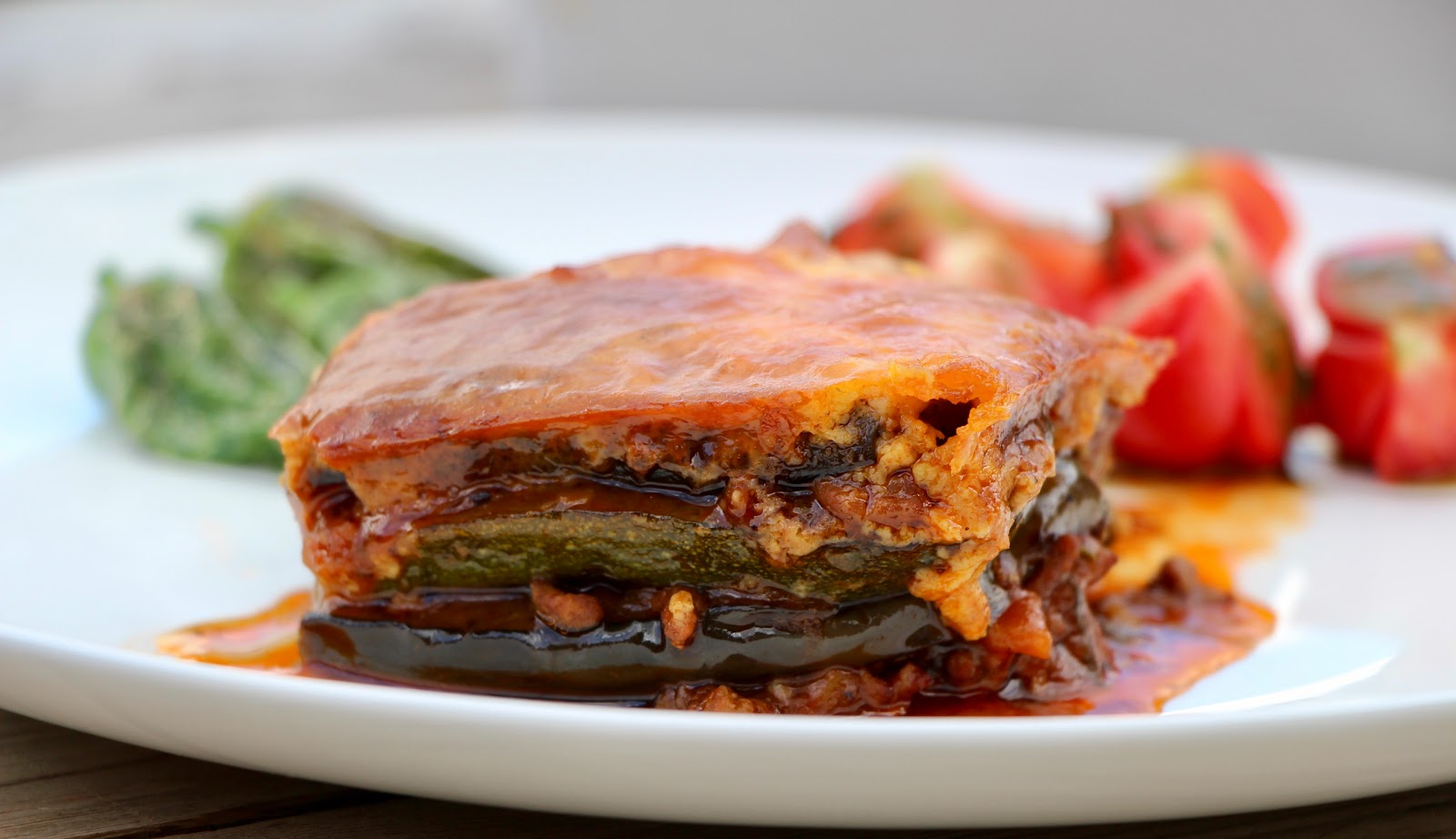 This Greek dish is traditionally made with Lamb mince, layered with slices of Aubergine and topped with Béchamel sauce. Being the summer season here, with plenty of fresh organic vegetables from the allotment, I have decided to use a combination of Aubergine and Courgette slices as the layers.