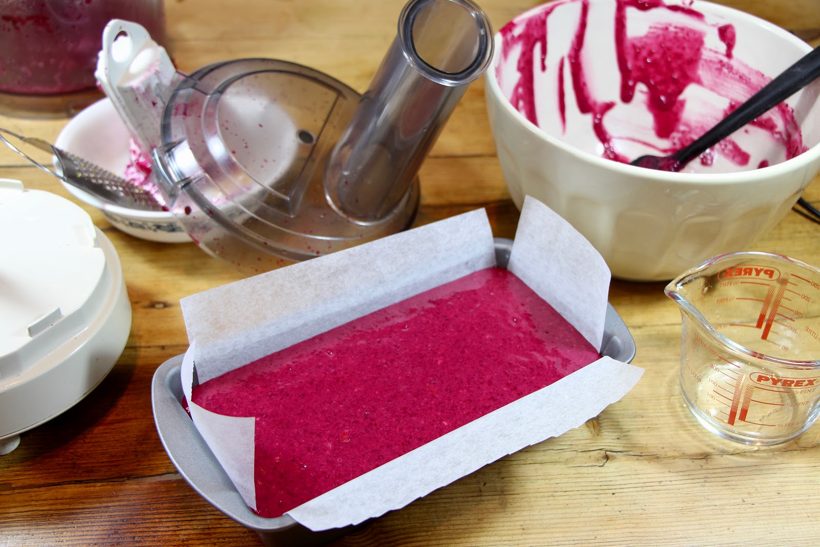 In a food processor place 225g cooked and grated Beetroot, with 100g each of Dark Brown Sugar and Light Muscovado Sugar. Blitz until sugar has dissolved into the beetroot. With the processor still running, drizzle slowly, 150ml of Sunflower oil. Crack 3 large eggs and pour into the Processor, this not only helps blend together but also add air into the cake mix.