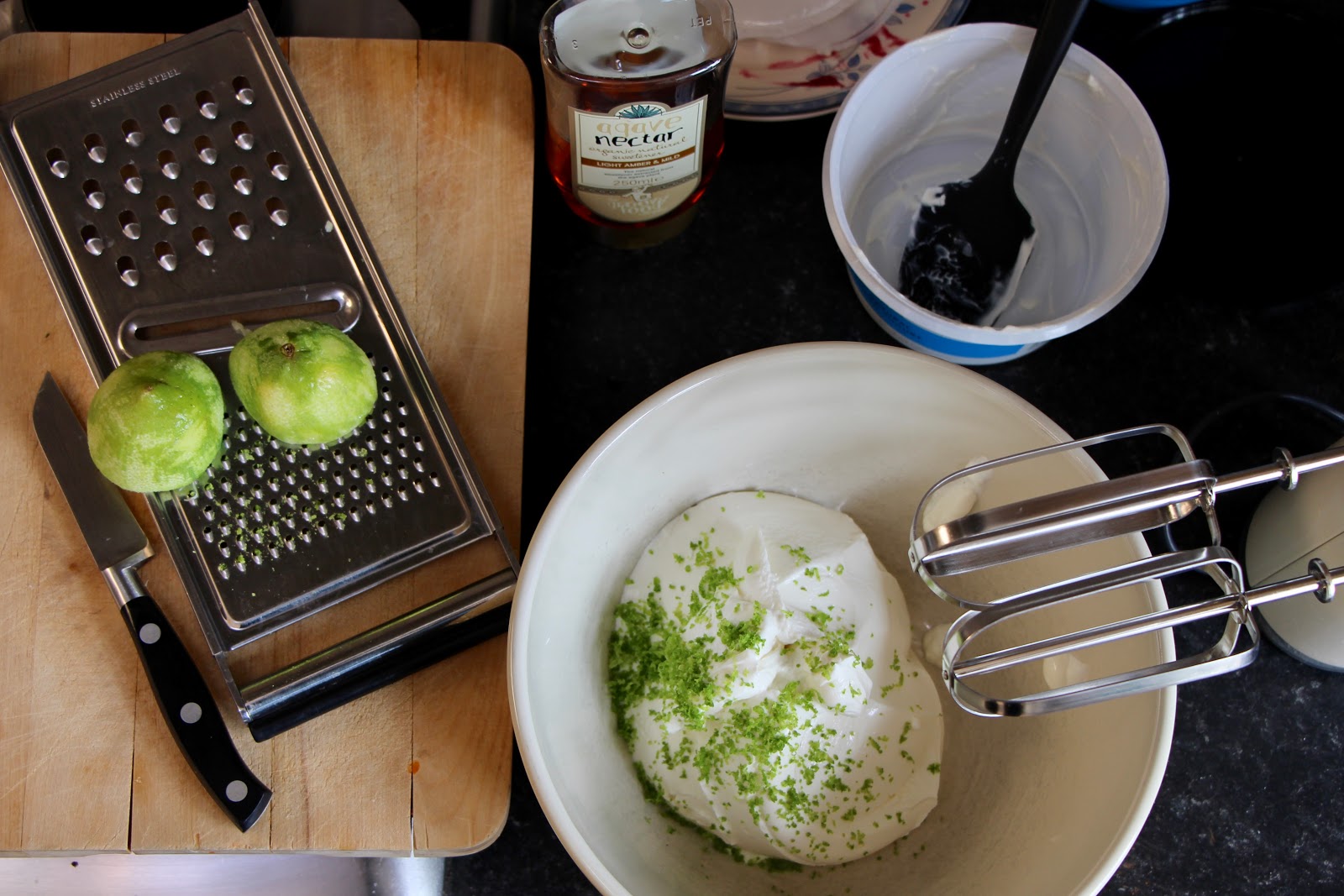 Next, take another 500g of full fat yogurt, add juice of 2 limes with zest of a lime and 3-4 tablespoons of Agave syrup. Taste to adjust sweetness. You do not want this lime flavour of of yogurt to be overpowering the blueberry flavour, just a pleasant hint of citrus. Whisk and place in another container and follow the same freezing process as whipped blueberry yogurt.