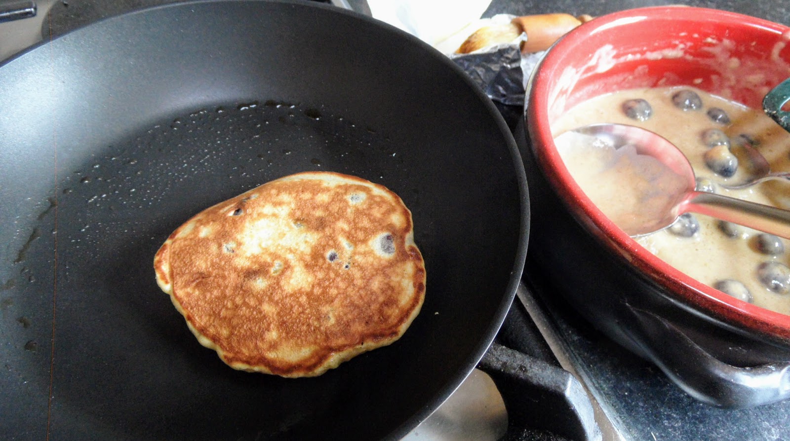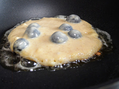- Add blueberries and coat all berries with pancake batter