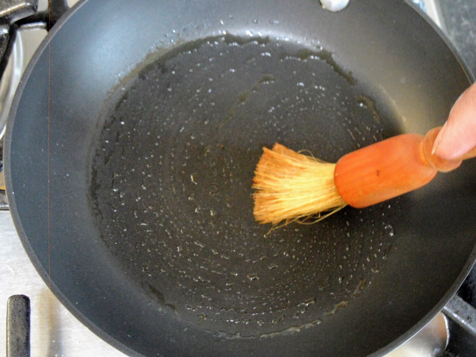 - Brush a little butter in a pan which has been heating over a moderate heat.