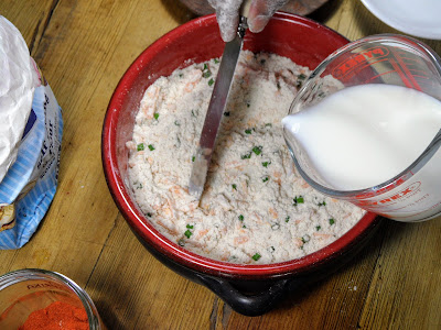 - Add milk a little at a time, until the dough comes together. Use a butter knife for this stage.