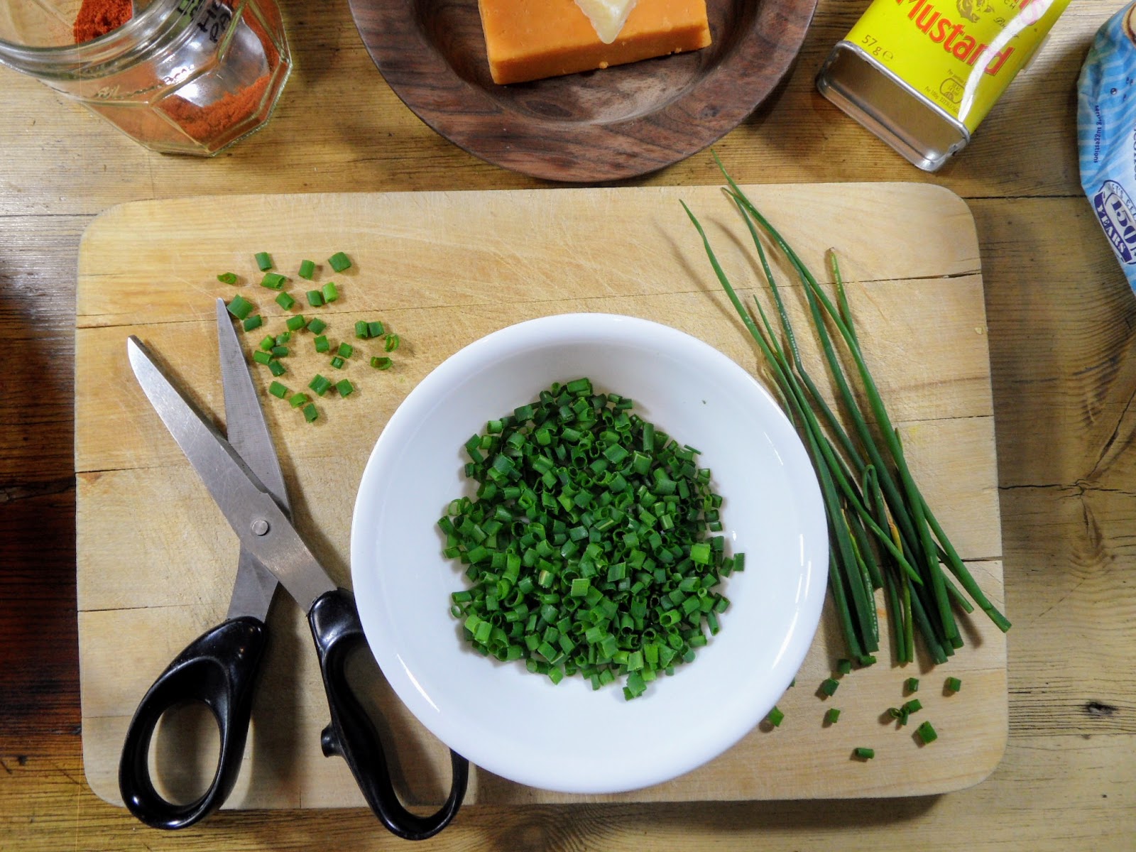 - Add Chives, as well as the grated cheese, paprika and mustard powder (optional).