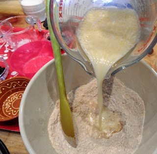 Gently add the egg mixture to the dry ingredients, stir until all flour is coated with the mixture.