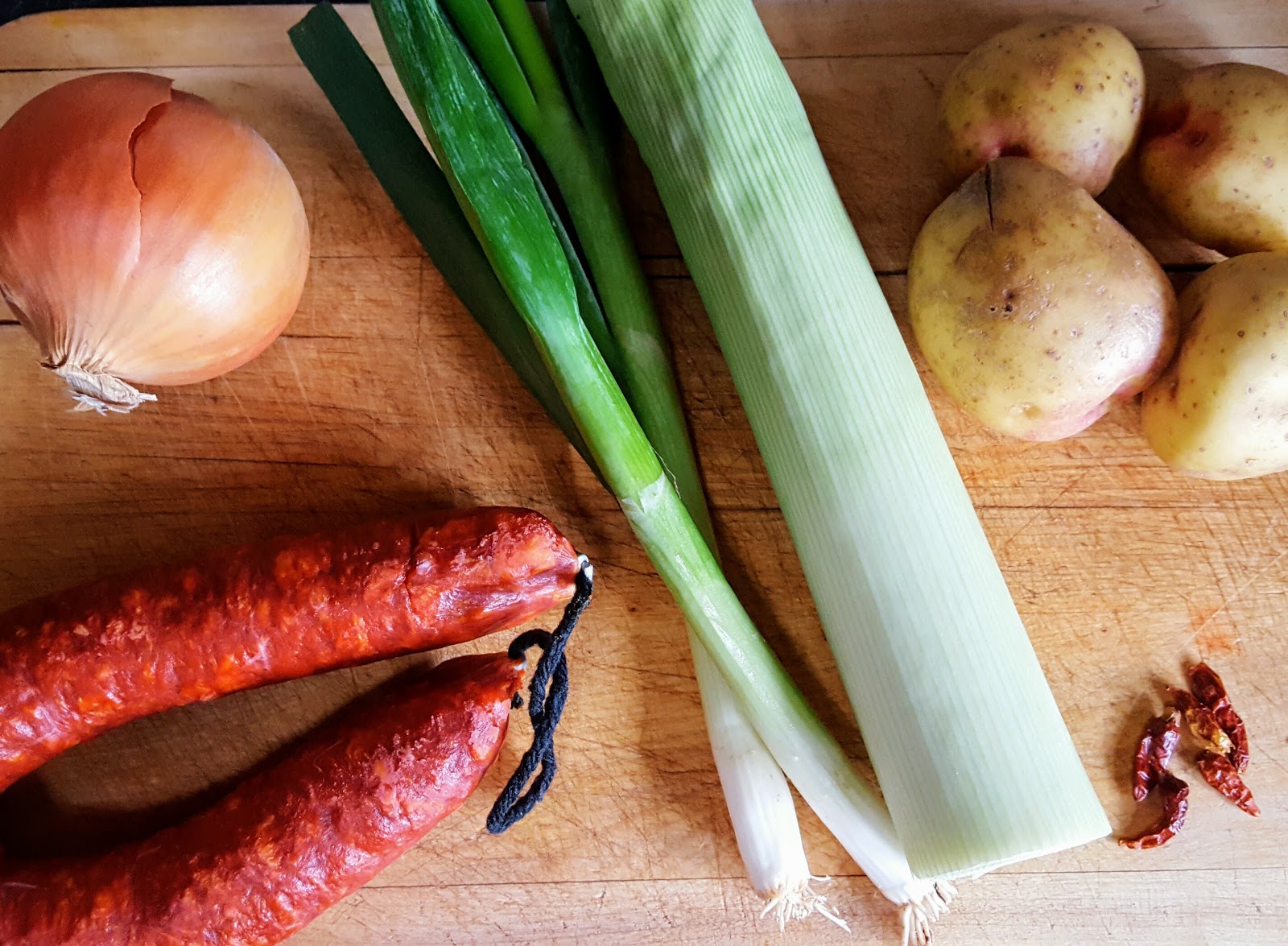 I love soups and at this time of the year it is my lunch time favourite. Yes, I can buy a tin of soup for under £1 or so, but nothing beats a bowl of homemade soup. Besides when you have homegrown organic potatoes and onions in store, I only had to buy a small size leek and a few spring onions and chorizo.