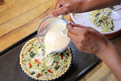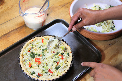 - Place in a preheated oven at 200˙C and cook for 30-40 minutes. Check after 25 minutes giving the tray a gentle shake to see if the custard mixture is ‘wobbling’ or still runny.