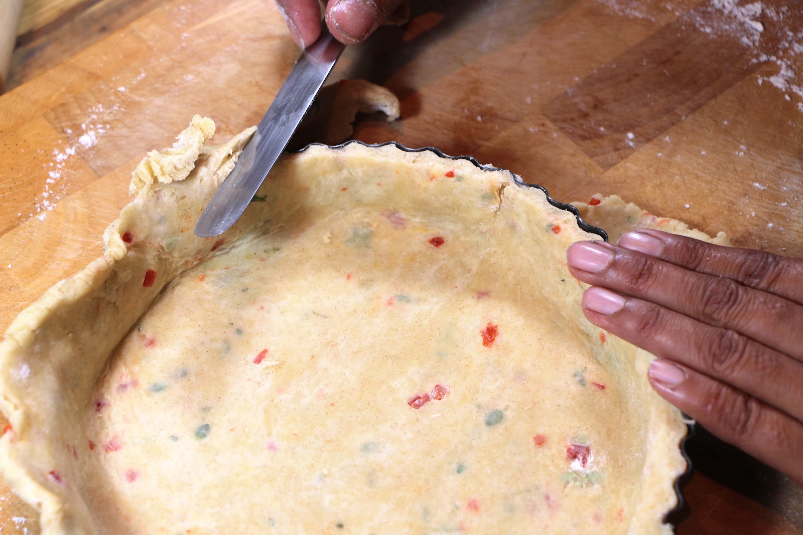 Leek, Potato and Mustard Greens Quiche with Pickled Jalapeño Pastry.