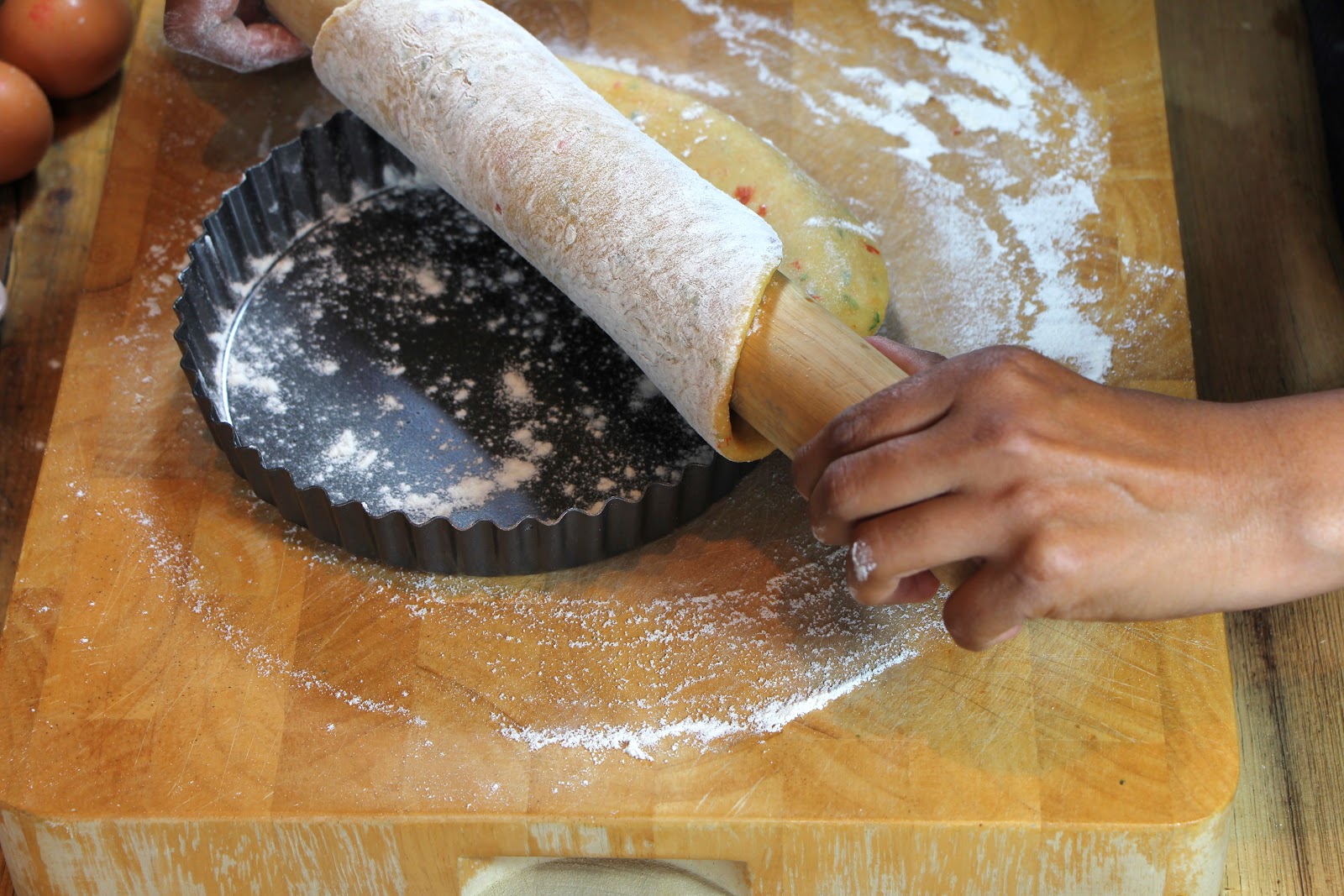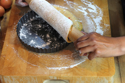 - Roll out dough. Place the rolling pin in the centre of the dough and with one motion roll away from you, turn the dough a quarter turn, roll and repeat process until the rolled out dough roughly measures slightly larger than the loose bottomed dish. I have used a 20cm (8inch) non stick fluted dish.