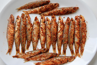 As for the spice mix, I do not use a pre made mix, as it’s a dry spice mix and very easy to put together. I must confess, my spice mix combination changes every time I make these. At times, made them with more chilli powder and no black pepper; as for this batch, it is made with a mix of 2 teaspoons of Kashmiri chilli powder, 1 teaspoon each of Ginger powder, Garlic Powder, ground Cumin, ground Coriander and dried Coriander leaves. A quarter teaspoon of Turmeric powder and half teaspoon of ground black pepper and sea salt. Mix well and sprinkle on the little fishes generously. This mix was enough for 400g of Sprats.
