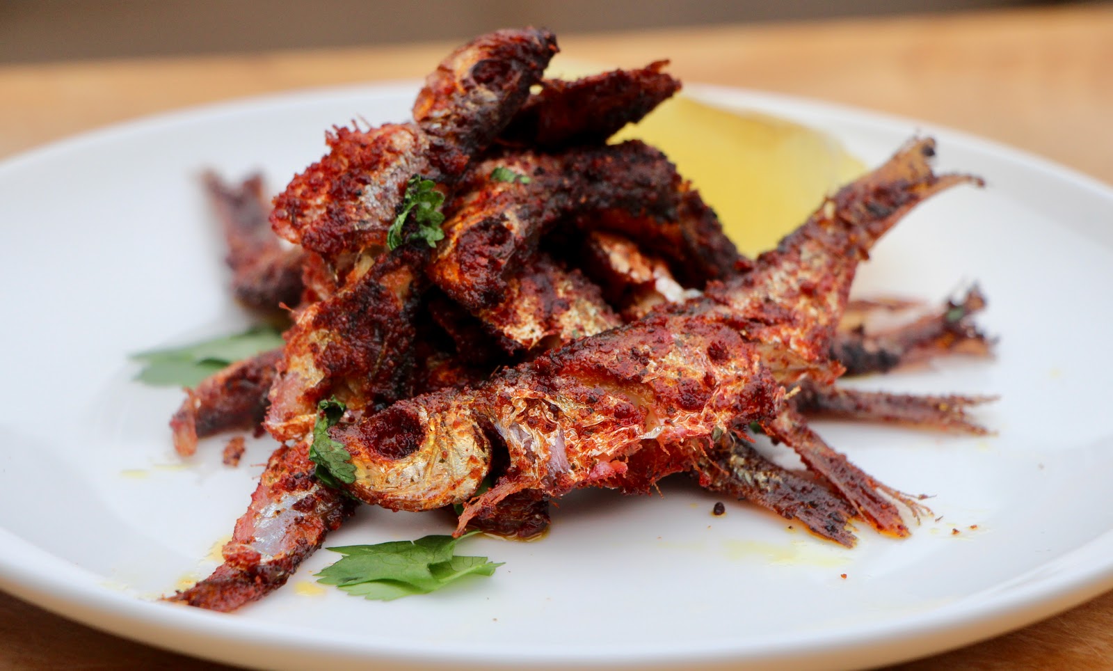 Heat a wide, flat bottomed non stick Pan and place enough Sunflower oil to shallow fry the Sprats, and do so carefully in batches, once the oil in hot. Cook them for 2 minutes or less on each side, carefully turning them. Remove and fry any more batches. Once all the fish has been fried; lower the heat and in the remaining oil, quickly pour in juice of half a lemon and a handful of freshly chopped Coriander, quick stir and add the fried fish to coat in the lemony oil.