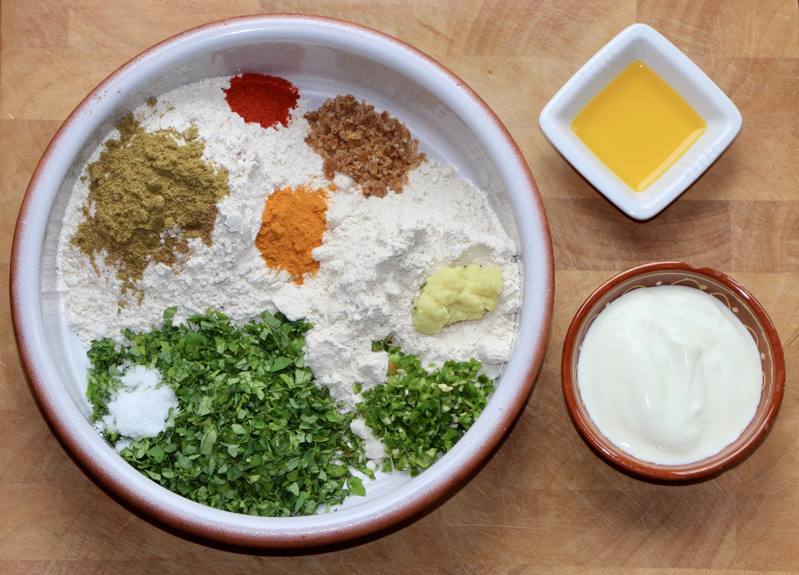 Ratio for the 2 flours to chopped fenugreek is 1:1:1 and add the spices to your taste.