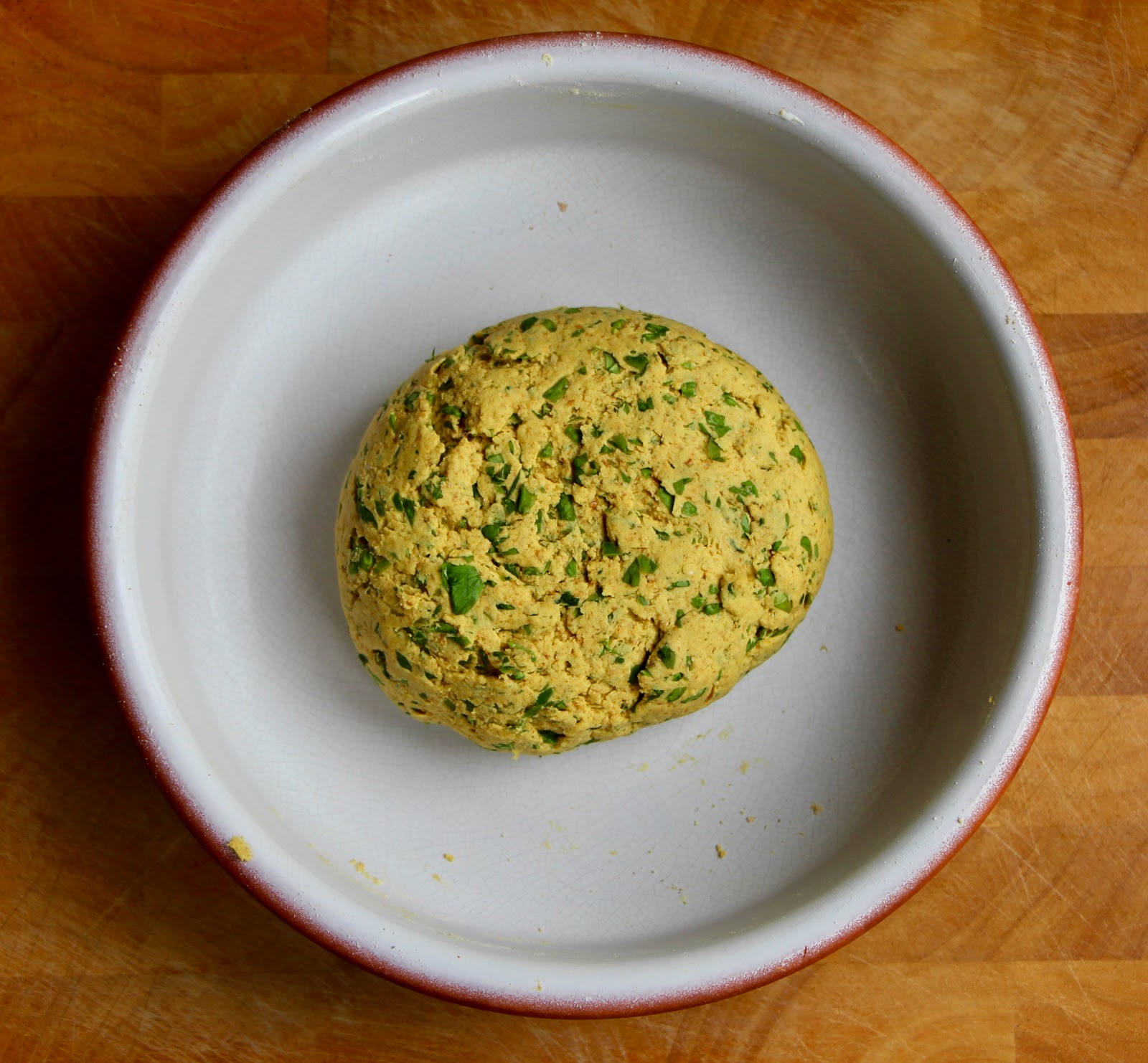 Here I have 1 cup of Chapatti flour; 1 cup of Millet Flour with a cup of chopped fenugreek leaves. As we like these a little spicy, I have added one tablespoon of fresh roughly chopped green chillies, a tablespoon of finely grated ginger with a teaspoon each of sea salt, Jaggery (if unavailable use dark muscovado sugar), cumin powder and coriander powder. Red chilli powder is optional of which I added a quarter teaspoon with half a teaspoon of Turmeric powder. Add 2 tablespoons of Rape Seed Oil and either with your hand or a spoon mix these ingredients in. Bind with yogurt, a tablespoon at a time, until the dough ball is formed and pliable and just right to roll without dough sticking to the rolling surface or the rolling pin.