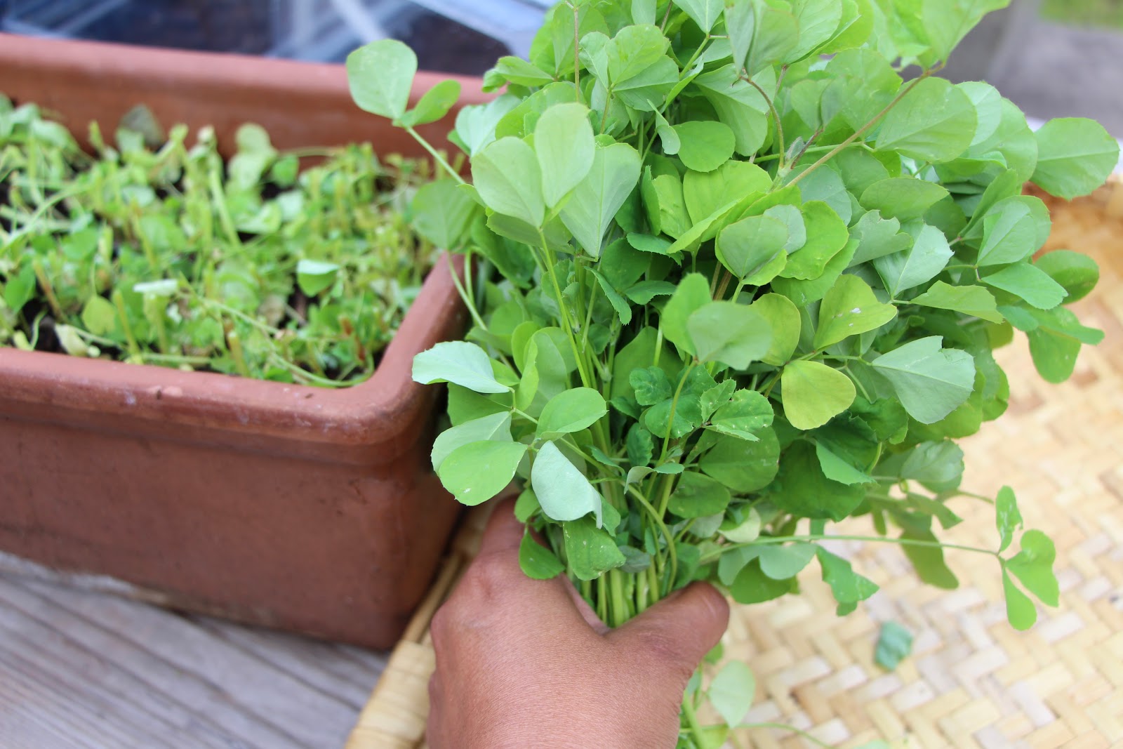Because I decided to harvest all the Kasuri Methi by cutting the whole plant off (left the roots to see if they grow again. Never grown this variety before, so it is a new experience in every stage from seedling to plate). Snipping of just the leaves of the stems, is a job done with patience. Only the leaves are needed for most recipes and I quite like this job, I find it therapeutic, oh dear, I think I am turning into my granny!
