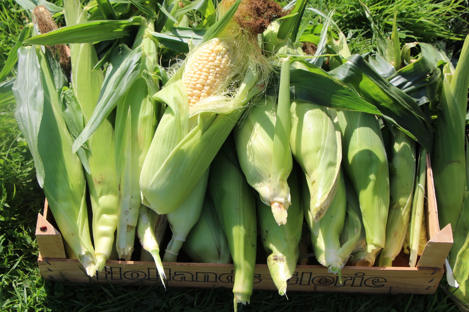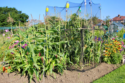 The variety I have grown for the past 2 years is an open pollinated Sweetcorn called Special Swiss. As soon as seed heads were forming on tops of the plants; just to make sure plants were being pollinated, I would work my way outside-in, shaking the plants, to allow the pollen to float to the other sweetcorn plants in the 4 x 4 grid formation. Once beards were forming on the cobs, it was time to net up and tuck the plants in. Allowing the cobs to swell up rather then being pecked at.