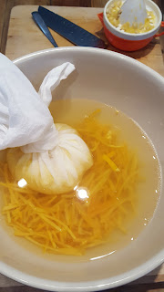 - Remove the muslin parcel into the colander, catching any liquid from this parcel by placing a bowl over the muslin parcel and squeezing out as much pectin out of this parcel as possible, returning this liquid back into the pan and discarding the contents from the muslin parcel.