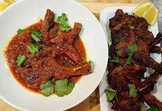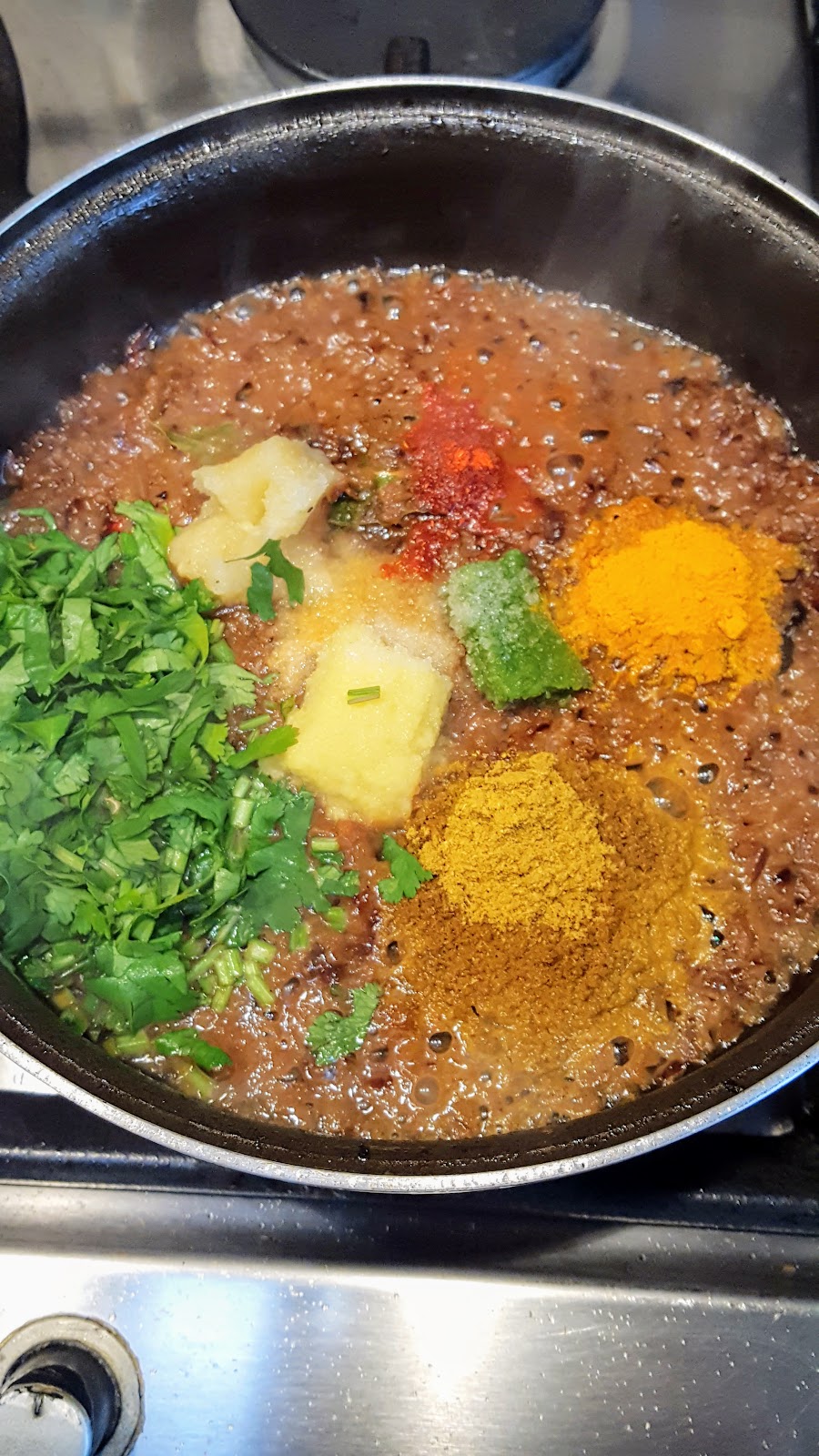 - Once you are happy with the colour of the onion (Note:Lighter the colour of onions, lighter the colour of sauce. I cooked my minced onion too a golden brown stage to achieve the dark sauce) add the rest of the spices, lemon juice and coriander with a little water, again this helps stop the burning of spices.