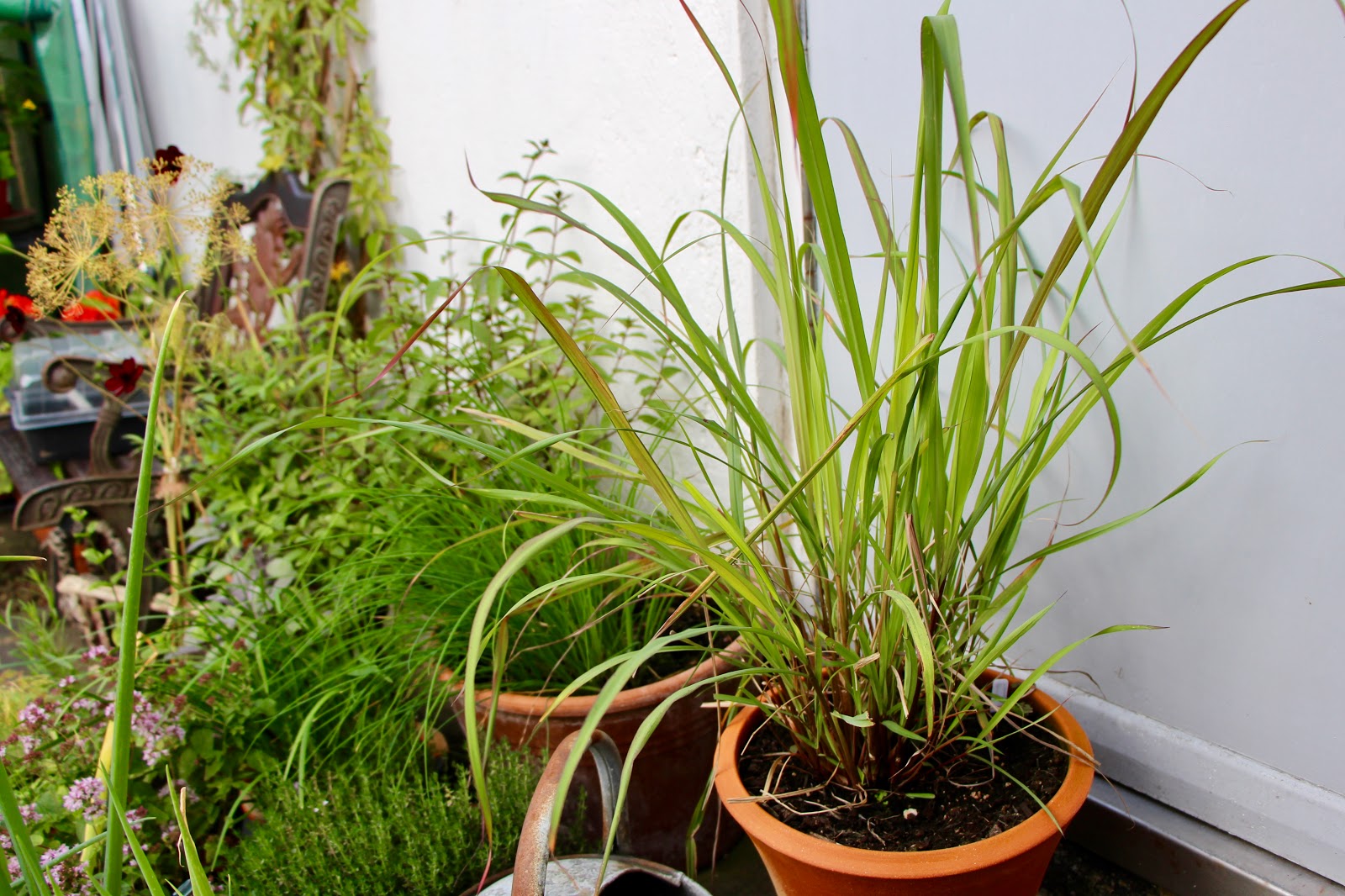 Fresh Lemongrass, shop bought, I find can be quite expensive. So I thought to myself why not grown my own. I never thought I could grow Lemongrass outdoors, here in UK until I read up on Jekka’s Herb . In January 2016 I started some seeds indoors on the kitchen window ledge and followed the instructions on the seed packet and was in a final planting position, a large pot, by April (same year). Lemongrass will not survive the winters, this is my only herb pot brought indoors during the cold months.